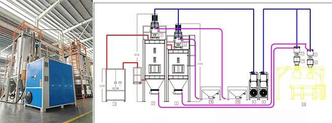 The three-stage treatment system, consisting of a crystallization barrel, dehumidifier and drying tower, prevents raw material agglomeration through crystallization pre-plasticization. Subsequently, through the dual effects of physical adsorption by the dehumidifer and heat conduction in the drying tower, the moisture content of the raw materials is controlled at an extremely low level. This process significantly enhances the melting uniformity of PET pellets, laying a solid foundation for subsequent plasticizing extrusion and ensuring the quality of the sheets.